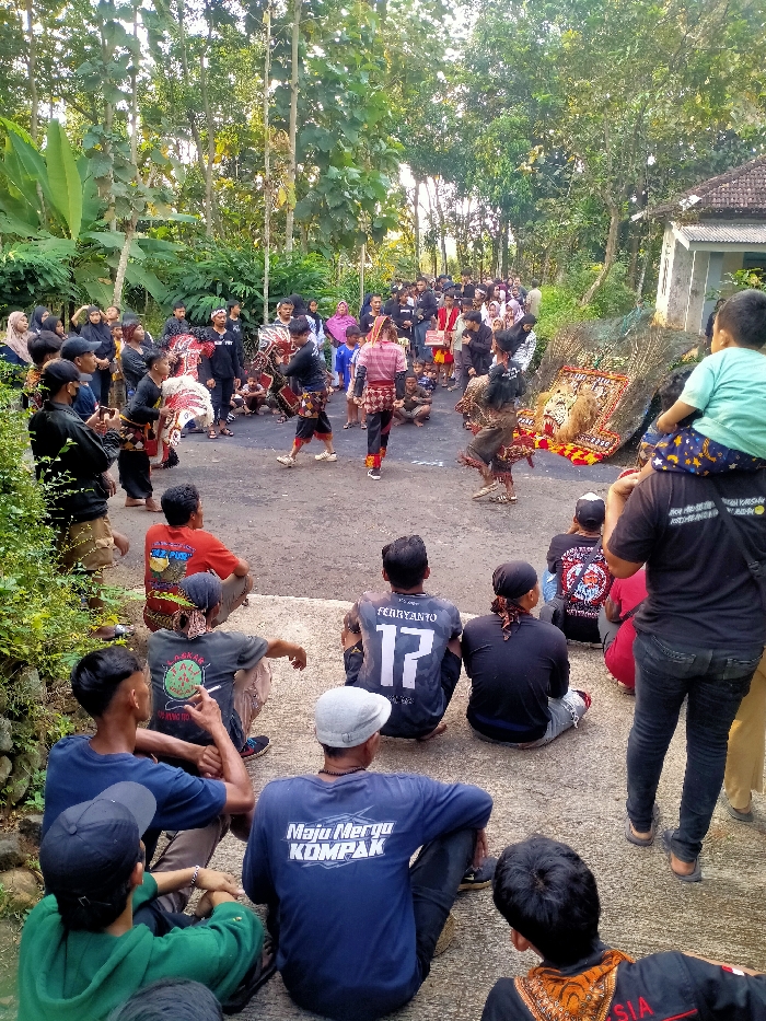 A street performance unfolds before a diverse audience. Dancers in traditional costumes, some with elaborate masks, perform on a paved road. Spectators, mostly men, sit or stand to watch. Many are dressed in casual attire, with some wearing t-shirts with writing. A child sits on an adult's shoulders for a better view. The performance takes place in a rural setting with trees lining the road and a few buildings visible in the background.