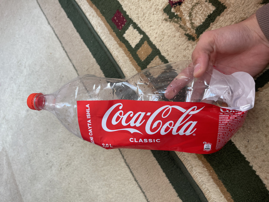 A partially crushed 2.0-liter Coca-Cola Classic plastic bottle is held in a human hand, positioned against a patterned carpet in Gurugli, Uzbekistan. The clear bottle is largely empty but contains visible water droplets on its interior and is sealed with a red screw cap. The iconic red Coca-Cola label is present, displaying "CLASSIC" and "2.0L," along with Uzbek text including "YENI QAYTA ISHLA" (Recycle). A hand with light to medium skin tone grips the lower, crumpled portion of the bottle. The background consists of a beige-colored carpet featuring dark green border stripes and geometric patterns in green and maroon hues.