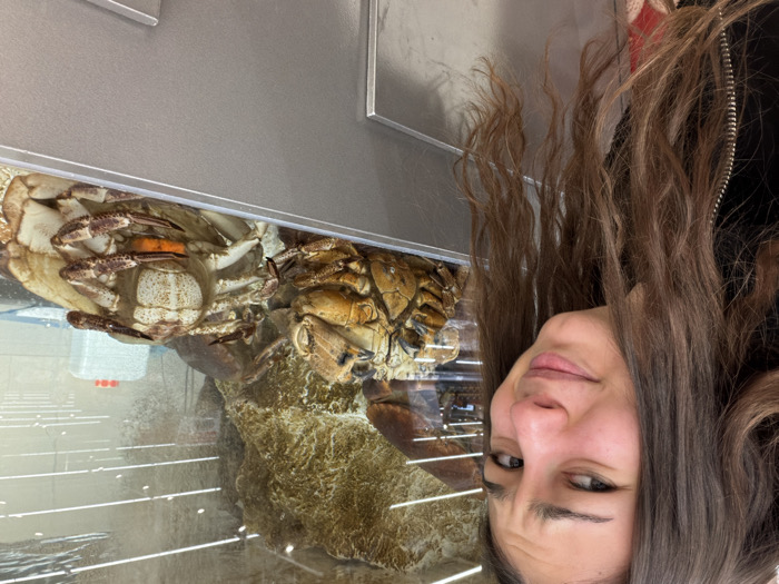 A woman with long brown hair holds her head sideways and gazes into a glass tank filled with water. Inside the tank are several crabs, some light-colored and speckled, others a darker brown. A textured, rock-like formation sits at the bottom of the tank. The tank is encased in a grey, metallic structure.