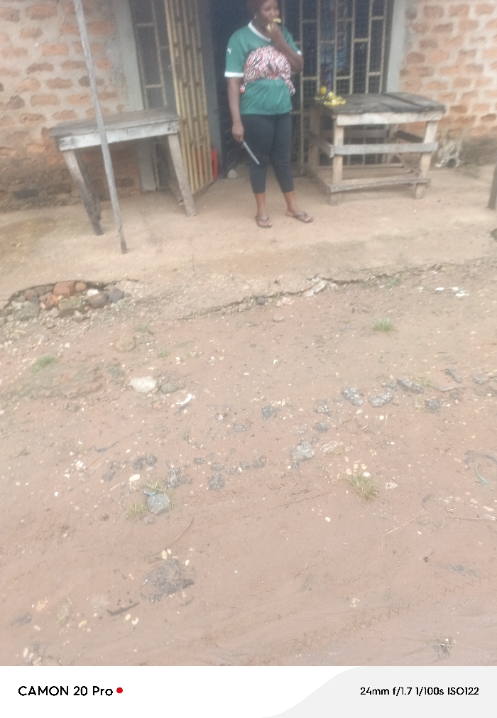 An outdoor scene in Markurdi, Nigeria, depicts an adult female standing in front of a brick building