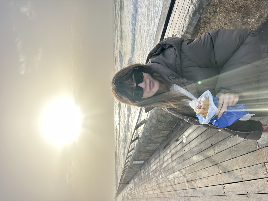 A female individual is positioned centrally on a wooden pier structure, facing the viewer. She has dark brown hair with a fringe and wears dark, rectangular sunglasses. Her clothing comprises a dark brown puffer jacket worn over a white garment. In her left hand, she holds a partially eaten food item, wrapped in white paper and a blue exterior sleeve. To the right of the individual, the Mediterranean Sea exhibits moderate wave action with visible whitecaps, separated from the pier by a concrete barrier with a metal railing. The wooden pier extends longitudinally into the background on the left. The sky is overcast but brightly illuminated by a prominent sun in the upper left quadrant, producing significant lens flare and a yellow hue. The scene is consistent with the Jaffa Port breakwater or similar coastal area in Tel-Aviv, Israel, during daylight hours.