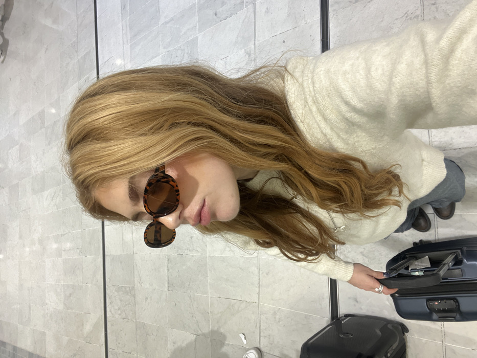A high-angle, portrait-oriented photograph captures a female subject from the waist up, facing left, in an indoor public space. The subject has long, wavy, light brown hair and wears oval-shaped, tortoise-shell pattern sunglasses, a light-cream textured knit sweater, light-blue or grey trousers, and dark footwear. A silver-toned chain necklace with a small pendant is visible around her neck, and a ring adorns her left index finger. Her left hand is positioned on the extended handle of a dark-blue rolling suitcase, which features a visible TSA lock. A second, black rolling suitcase is partially visible behind and to the left of the primary suitcase. The floor is composed of large, light-grey square tiles with darker grout lines, featuring a dark horizontal divider strip in the foreground. A white shoe is partially visible on the floor to the far left. The environment is consistent with an airport terminal, located in Tremblay-en-France, France, likely Charles de Gaulle Airport.