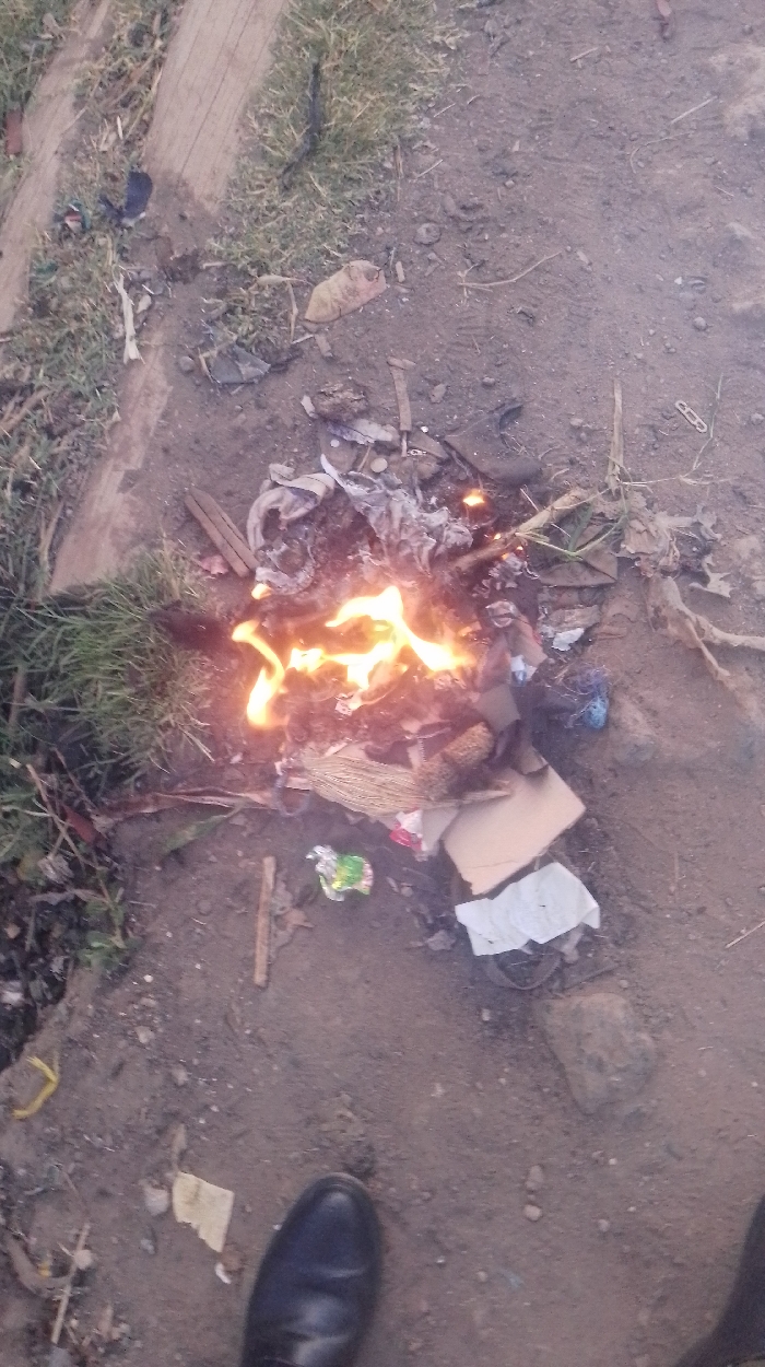 A small fire burns on the ground amidst scattered trash, including paper, cardboard, plastic, and bits of fabric. Patches of green grass border the area. The ground is dirt and rocks. A pair of black shoes are seen in the lower part of the image.