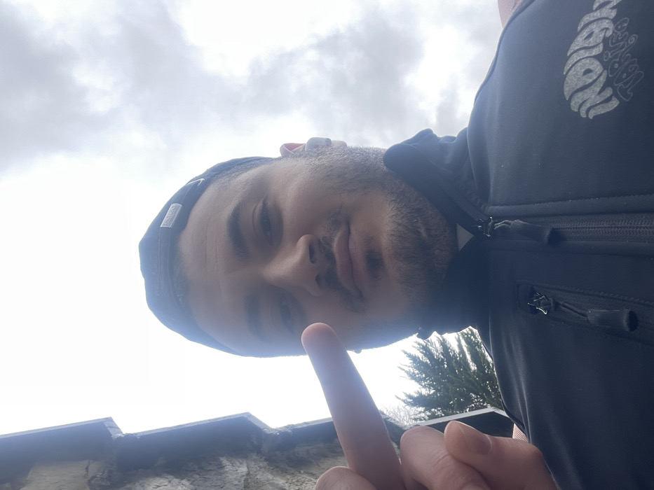 A male subject is captured in a close-up, low-angle image, positioned in the city of Eibar, Spain. He presents with a beard and mustache, and is wearing a dark baseball cap reversed, a black softshell-style jacket with a high collar and multiple zippers, and a white earbud in his right ear. The jacket features a stylized light-colored logo, appearing to read "INDIAN TARIXA", on the wearer's right chest. The subject's left hand is raised, with the middle finger extended upwards. The background consists primarily of a bright, overcast sky with visible clouds. A section of a stone building facade, a roofline, and green tree foliage are visible on the left side of the frame.