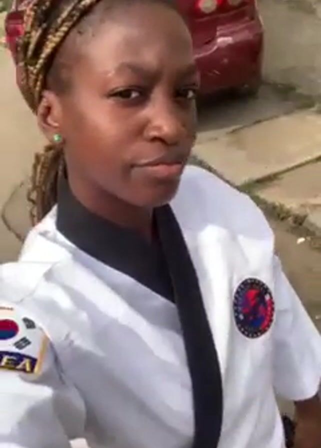 A person wearing a white taekwondo uniform with a black belt is recording themselves on a mobile phone. They have braided hair with some blonde highlights, and are standing on a street with cars parked on either side. The person looks directly into the camera, then looks to the side and gestures with their hand. The background shows a building and other people walking. The camera is held at chest level, creating a selfie perspective.