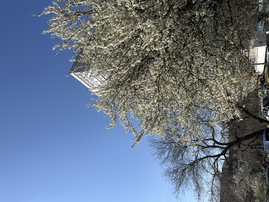 The image captures an urban street scene in Varna, Bulgaria, under a clear, bright blue sky. A large deciduous tree in full white bloom, likely a plum or cherry, dominates the right and central foreground, its branches visibly adorned with sparse red decorative threads (Martenitsi). To the left of this blooming tree, a tall, bare deciduous tree with dark, intricate branches stands, with another smaller blooming tree visible further back on the left. In the background, partially obscured by the foliage, the upper stories and corner of a multi-level, light-colored concrete building, consistent with an apartment block, are visible, featuring multiple windows. The bottom edge of the image displays parked vehicles, including a silver sedan and a yellow car, indicating a street or parking area. No people or specific actions are discernible within the frame. The presence of both blooming and bare trees, combined with Martenitsi, suggests an early spring setting.