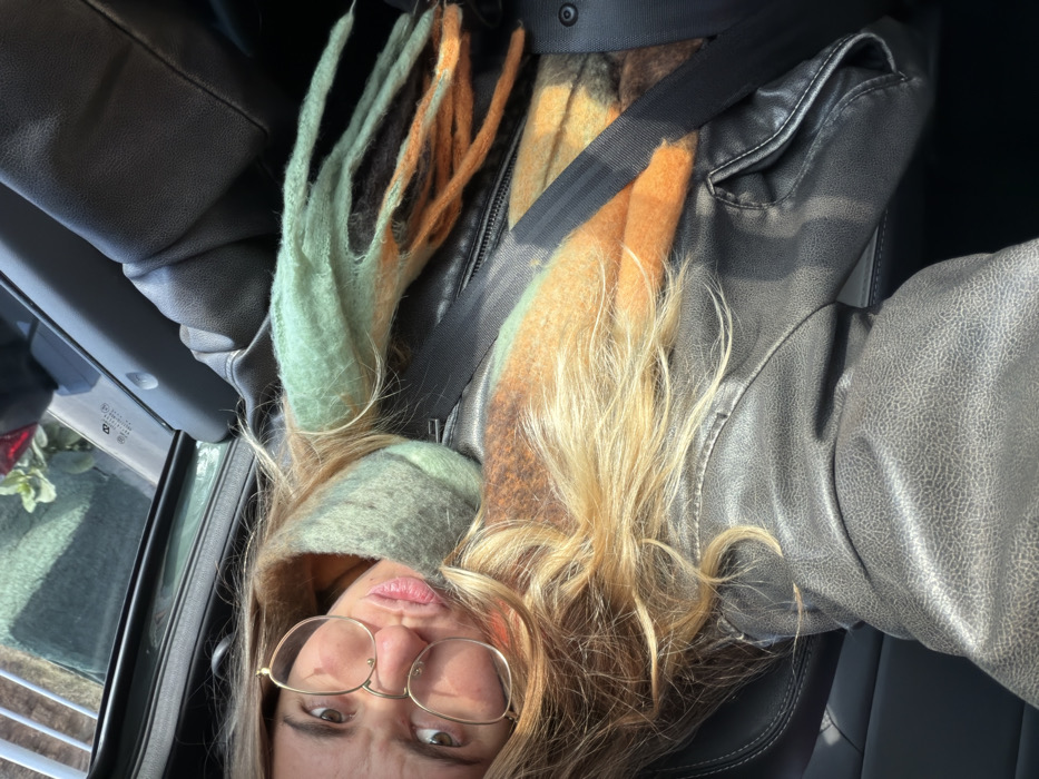 An individual is depicted from the chest up, seated inside a vehicle. The subject is a female with long, wavy, light-colored hair, wearing gold-rimmed, round eyeglasses. Her lips are pursed, and her gaze is directed towards the camera. She is clad in a dark, possibly leather, jacket and a multi-colored scarf displaying light green, orange, brown, and black sections. A black seatbelt is fastened diagonally across her chest. The vehicle's interior is dark-toned, with direct sunlight entering from the left, creating distinct shadows. Through a window in the upper left, blurred green foliage is visible outside. The image provides no discernible specific visual cues to confirm the location as Interlomas, Mexico.
