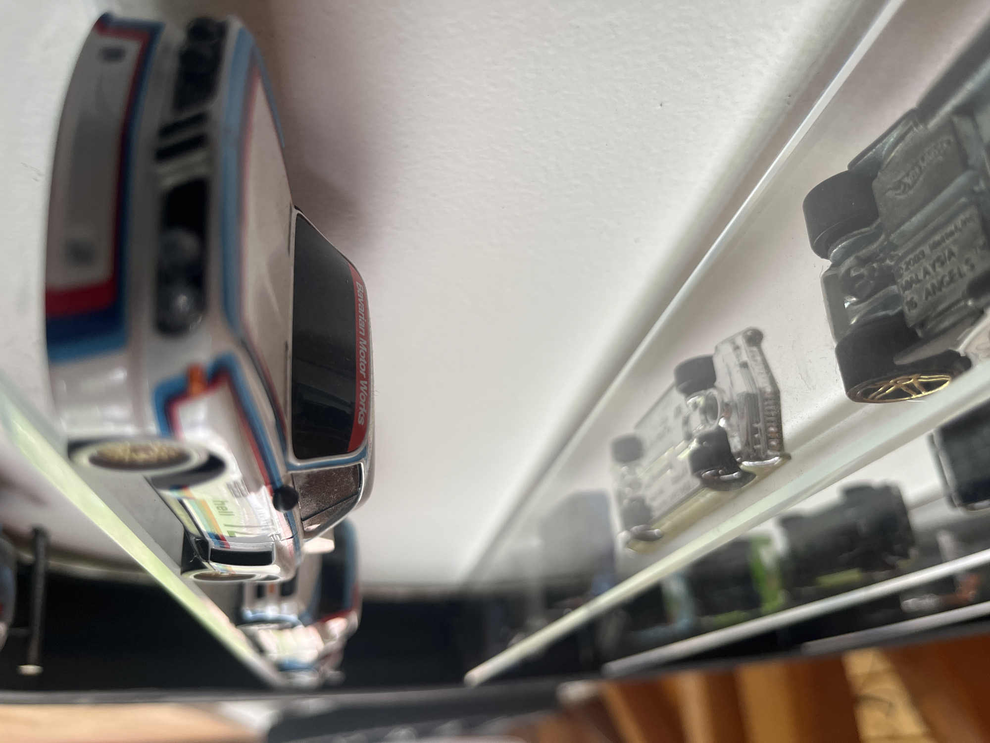 collection of Hot Wheels toy cars displayed on shelves. The cars are arranged in rows and are various colors and designs. One of the cars has "Bavarian Motor Works" printed on its side. The location is not discernible from the image.