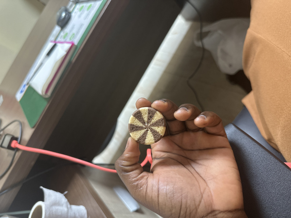 The scene is set indoors in Shaba, Nigeria. A dark-skinned human hand, positioned in the foreground, holds a circular biscuit. The biscuit features a distinct bicoloured pinwheel pattern on its visible surface, consisting of eight alternating light brown and dark brown segments radiating from a central point. The hand grips the biscuit between the thumb and forefinger, with other fingers curled beneath. In the background, a wooden desk surface is visible. On the desk, from left to right, are a partially visible roll of white material, a black electronic component connected to an orange cable that extends diagonally across the scene, a green mat, a stack of white papers or documents with pink edging, a pair of metallic scissors, and a dark circular object. Below the desk level, a lighter-toned vertical surface is present, with a white plastic bag partially discernible within a shadowed recess.