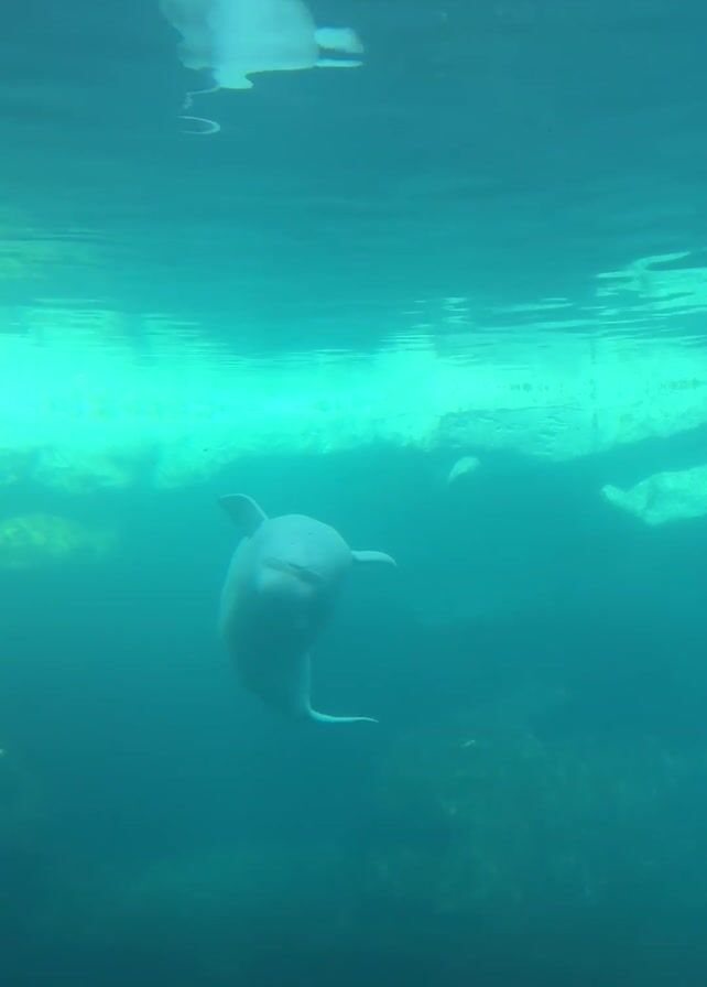 beluga whale swimming in clear blue water. The whale swims towards the camera before turning and swimming toward the surface. The surface of the water and the reflection of an individual are visible above the whale. Rocks or other items are visible underwater.