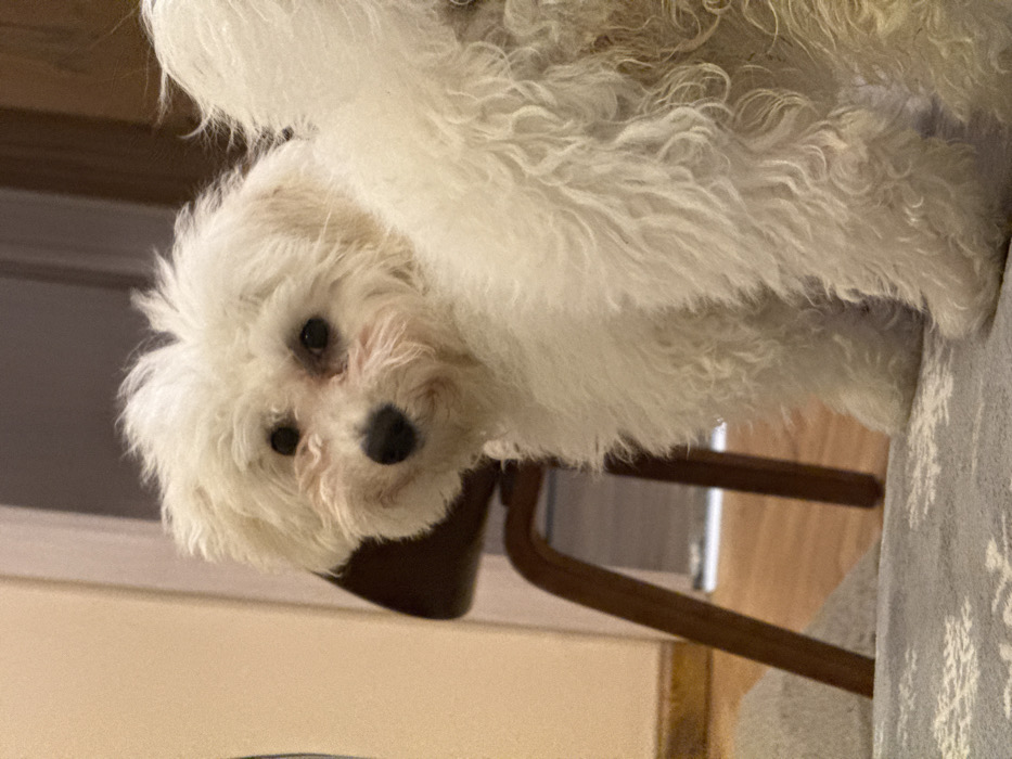 - "A small, white, fluffy canine, consistent with a Bichon Frise or similar breed, is positioned indoors, looking over its right shoulder directly at the viewer" by FM-91Fwq1, licensed under CC BY 4.0