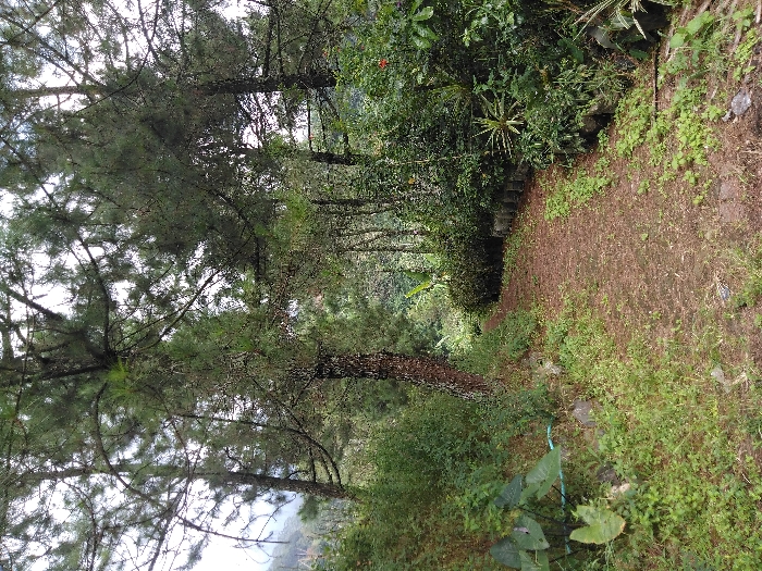 The image displays an unpaved, reddish-brown dirt path traversing a heavily vegetated area identified as El Rincón de Monagas, Venezuela. The path originates in the foreground, extends towards the center, and curves slightly left as it recedes into dense foliage. Dominating the scene are numerous mature pine trees with dark green needles, their rough-barked trunks rising vertically on both sides and extending beyond the frame, creating a partial canopy against an overcast, light grey sky. On the left side of the path, the ground slopes gently upward, covered in dense green undergrowth, small plants, and a prominent large-leafed plant in the lower-left quadrant. A segment of a blue PVC pipe is partially visible horizontally within the foliage near the bottom-left. On the right side of the path, a low linear arrangement of dark-colored barriers or planters defines the edge. Behind these barriers, a diverse array of dense tropical vegetation is present, including various broad-leafed plants, some exhibiting red hues, and several smaller plants in black containers or nursery pots. In the background, especially to the far left, faint outlines of distant hills or mountainous terrain are discernible through a slight atmospheric haze. The scene is illuminated by diffused natural light. No human figures, animals, or specific actions are depicted.