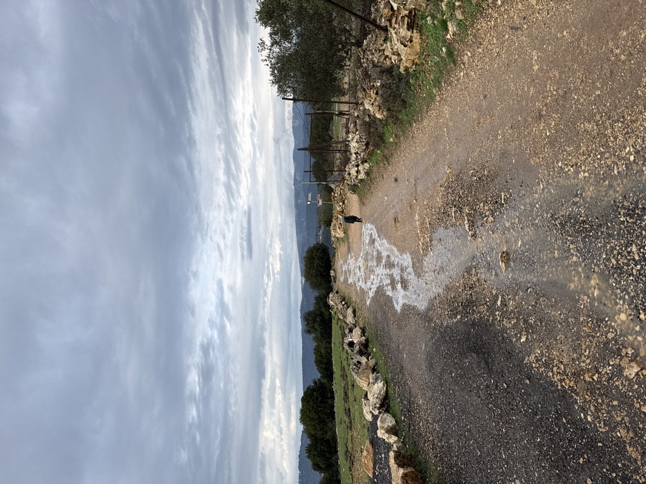 The image depicts an unpaved, gravel and dirt road in Mitzpe Hila, Israel, under an overcast sky