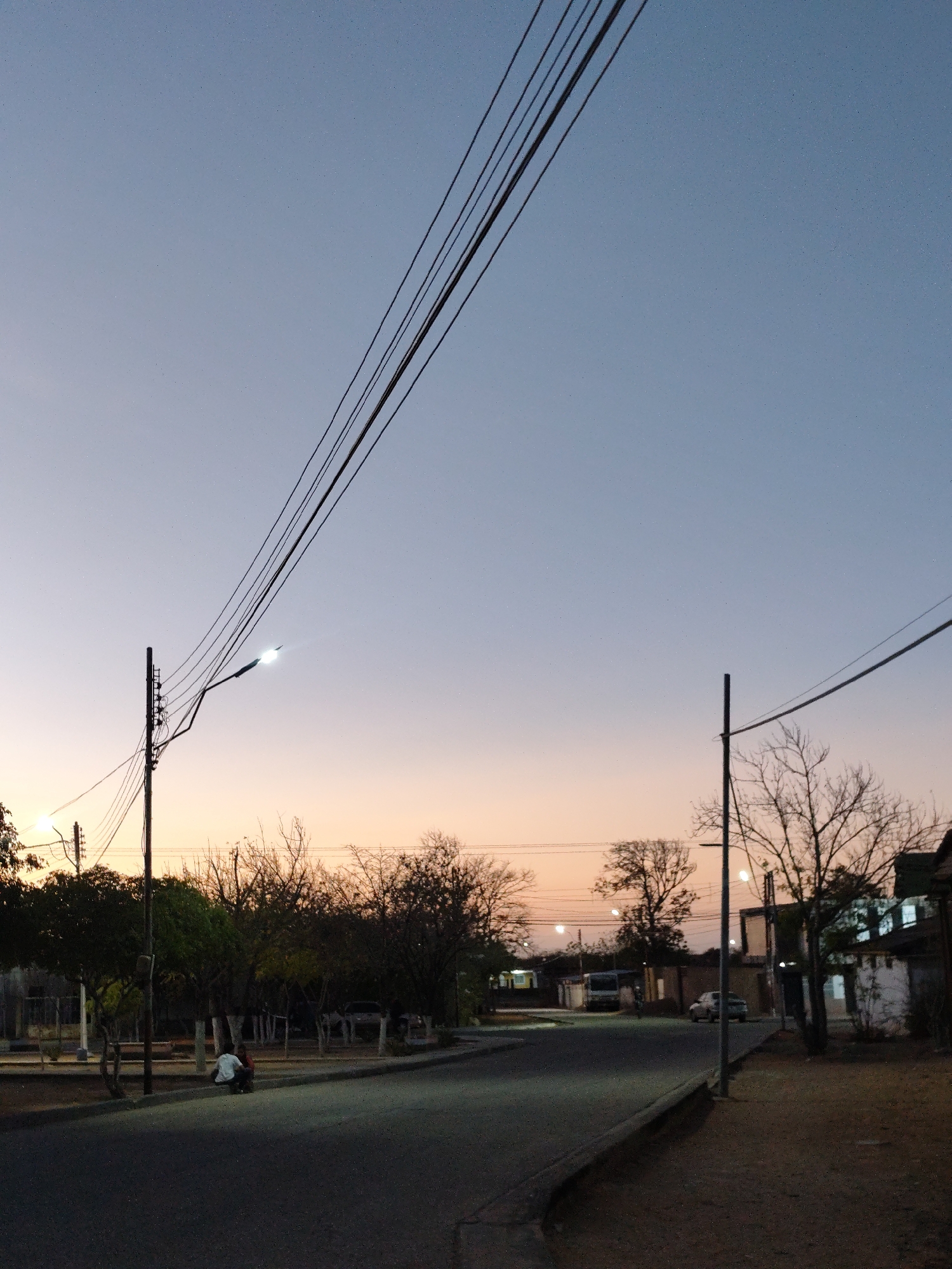 The scene depicts a street in Las Hernández, Venezuela, at dusk or dawn. The upper portion of the sky transitions from light blue at the zenith to a pale orange-pink at the horizon. Multiple dark electrical wires span diagonally across the upper left sky. A paved road curves slightly right in the foreground, bordered by a concrete curb and dirt shoulder. On the left side of the road, a utility pole with multiple cross arms supports an illuminated streetlight, casting a bright white glow. Beneath trees with dense green foliage on the left, two individuals are present: one wears a light-colored shirt and dark pants, sitting or crouching at the road's edge near the curb; another, partially obscured behind them, wears a dark top and red bottoms. Various trees with sparse or bare branches line the street and backdrop, particularly on the right and in the middle distance. Additional streetlights are dimly visible further down the road. In the middle distance, a light-colored sedan is visible on the right side of the road, and a larger, dark-colored vehicle, possibly a bus, is parked or moving on the left. Buildings with some illuminated windows are discernible behind the trees on both sides of the street.