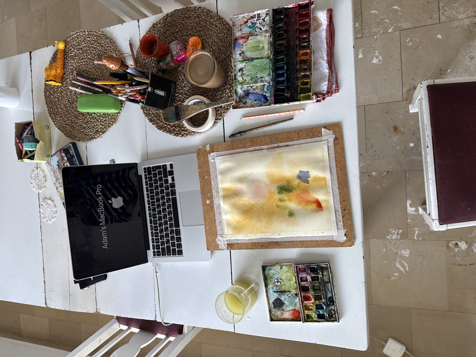 A white table holds various art supplies. A laptop with "Adam's Macbook Pro" engraved is open. Two woven mats display cups, paintbrushes, pencils, a giraffe figurine, and masking tape. A watercolor painting in progress is mounted on a board, alongside two watercolor palettes. A glass of yellow liquid is near one palette. Another palette is positioned near folded towels and two painting brushes. A white chair with a maroon cushion sits to the side.