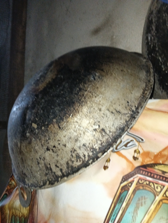 - "An inverted, heavily soiled metal cooking pot, consistent with a wok or large pan, is depicted resting on a decorated surface in Kampung Buang Abai, Malaysia" by FM-FF3l92, licensed under CC BY 4.0