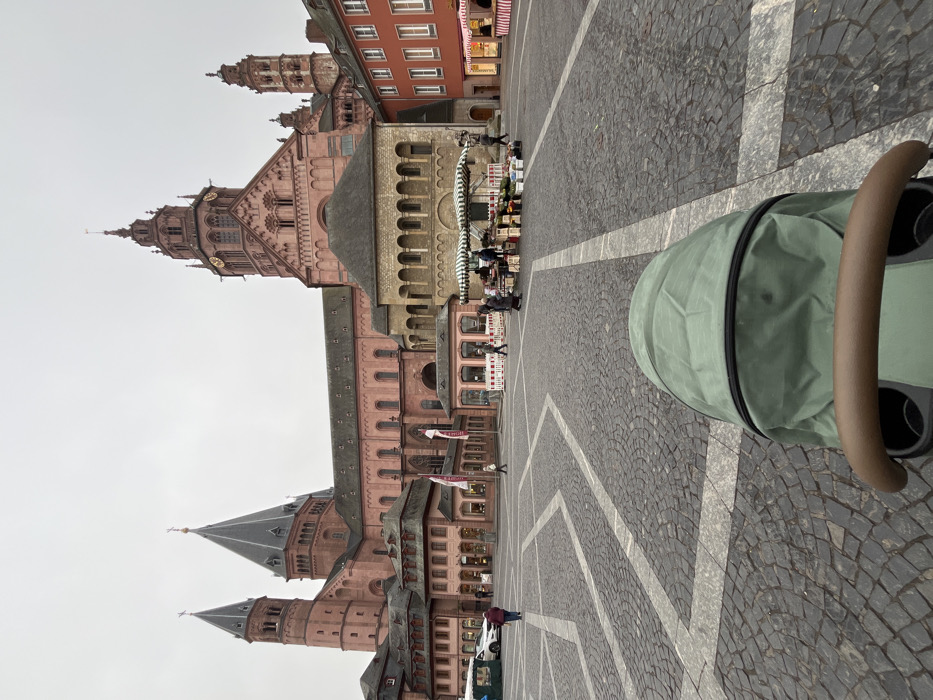 The image presents a ground-level view of the Domplatz (Cathedral Square) in Mainz, Germany, on an overcast day. In the immediate foreground, the upper portion of a green stroller, featuring a brown handlebar and two black cup holders, occupies the lower center of the frame. The ground is paved with dark grey cobblestones, intersected by distinct light grey geometric lines forming large patterns. In the midground, a public square is active with approximately a dozen individuals walking across it. Two market stalls are visible towards the right side of the square; one features a green and white striped awning displaying produce, while another, partially obscured on the far right, has a red and white striped awning. A stone building with arched openings and a dark roof stands behind the central market stall. To the left, a complex of multi-story buildings with reddish-brown facades and varying architectural styles houses commercial establishments. A white van is parked near the leftmost building. To the right, a multi-story reddish-orange building with numerous windows borders the square. The background is dominated by the Mainzer Dom (Mainz Cathedral), a large Romanesque cathedral constructed from reddish-pink sandstone. The cathedral features multiple towers; two prominent towers with dark grey conical spires are visible on the left side of the main structure, and a taller, more ornate octagonal tower with a visible clock face stands on the right, accompanied by a smaller, similarly designed tower. The cathedral's facade displays intricate architectural details, including arched windows and decorative elements. The sky is a uniform, light grey, indicating an overcast condition.