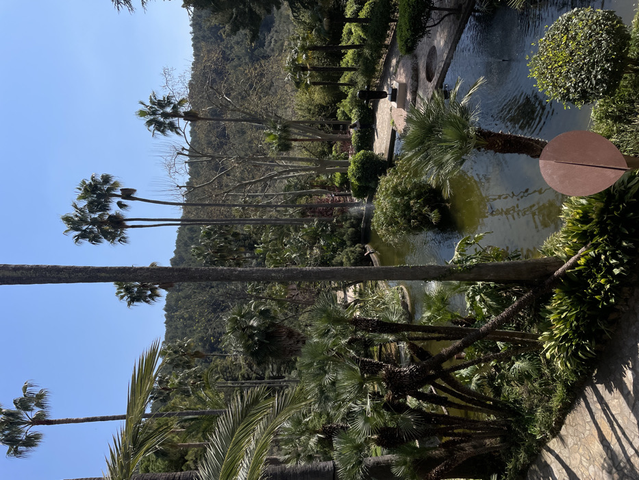 This image captures a section of a lush, manicured garden located in Bunyola, Spain. The scene is dominated by a serpentine pond of dark green water, featuring a small, bubbling fountain that creates ripples near a central island of dense green shrubs. To the lower right, a smaller, shallower water basin is visible, also with fountain activity. Various palm tree species populate the garden, including several very tall, slender palms extending towards a clear blue sky, and numerous shorter, stockier palms with thick trunks and fan-like fronds, some clustered and leaning. The vegetation is dense, comprising a mix of tropical and Mediterranean plants, including leafy shrubs and ground cover. In the middle ground, several deciduous trees with bare branches are intermingled with the palms, backed by a distant, forested hillside under bright sunlight. A light-colored stone pathway, composed of irregular flagstones, is visible in the lower left foreground, partially shaded, and descends into the garden. In the middle-right, on a paved area adjacent to the water, a dark, abstract, humanoid sculpture stands on a raised pedestal. Beyond the sculpture, two indistinct figures are seated on a bench or ledge. In the immediate lower right foreground, a reddish-brown, circular metal object, vertically segmented, is partially visible. The bright sunlight casts defined shadows, particularly on the stone pathway. No specific actions or interactions are clearly discernible beyond the presence of individuals within the garden environment.