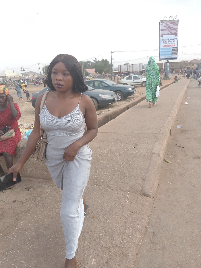 A woman with dark hair and a light gray dress walks towards the viewer. She carries a beige bag over her shoulder and holds a black object in her left hand. In the background are cars parked alongside a curb, with people walking in the distance. Another woman, wearing a green patterned garment, walks away from the viewer on the sidewalk. A billboard stands tall behind her. The area appears to be a bustling public space.