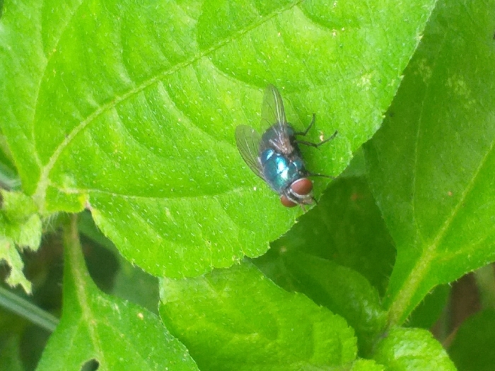 - "A vibrant green leaf fills the frame, providing a perch for a metallic blue-green fly" by FM-lF8872, licensed under CC BY 4.0