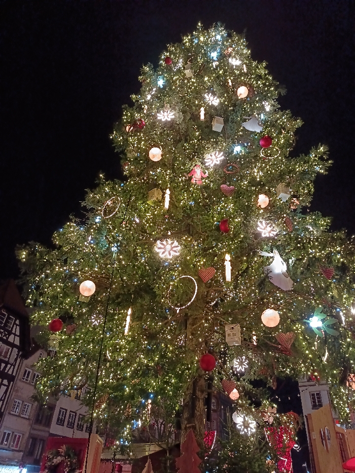 A brightly lit Christmas tree dominates the scene, adorned with a multitude of ornaments including spheres, snowflakes, candles, hearts, and other festive decorations. Tiny white lights are intertwined amongst the green foliage, casting a warm glow. In the background, buildings with distinctive architectural details are visible, suggesting an urban setting at night. The sky above is dark.