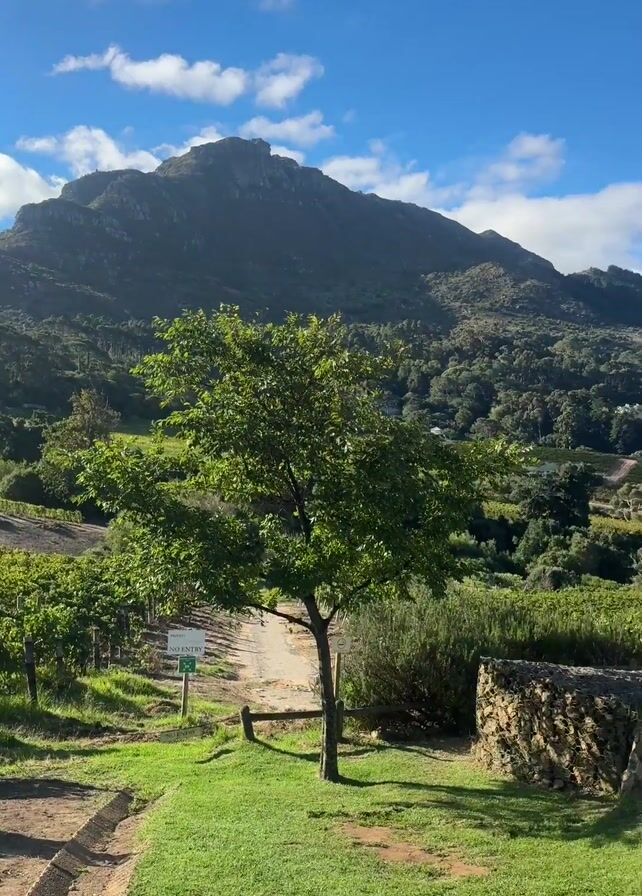 sunny landscape with a large mountain in the background and a vineyard in the foreground. The vineyard has rows of grapevines, and there is a dirt road running through it. In the foreground, there is a green grassy area with a tree and a wooden fence. The sky is blue with a few scattered clouds. The camera pans slightly from left to right. There is a small stone structure on the grass. A sign is visible near the beginning of the dirt road.