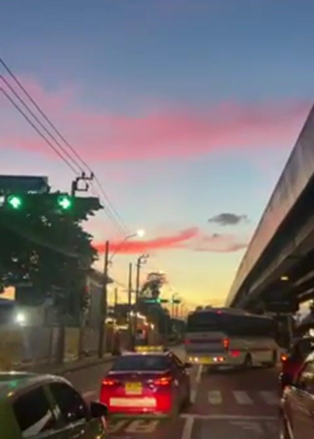 n urban street scene at dusk. The sky is a blend of blue, orange, and pink hues, with the colorful clouds adding a dramatic effect. Traffic lights are visible, with one currently showing a green light. The road is lined with various vehicles, including a green car, a red taxi, and a white bus. Overhead, an elevated highway structure looms, casting shadows on the road below. Power lines and street lights punctuate the scene. Overall, it's a tranquil moment amidst urban infrastructure, captured during a vivid sunset.