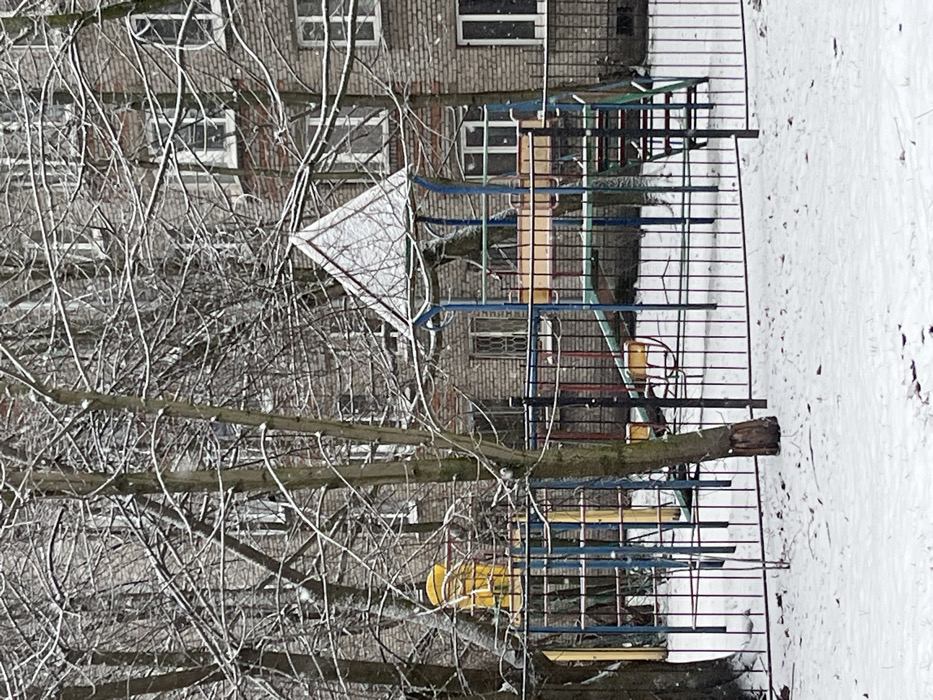 The image depicts a snow-covered urban scene in Saint Petersburg, Russia, during winter. The central focus is a children's playground, enclosed by a black vertical-bar metal fence, with snow covering both the playground area and the foreground. Within the playground, several pieces of equipment are visible: a climbing structure featuring a white pyramidal roof supported by blue metal poles, a green slide descending from a platform, and two swings with orange-beige seats. Additional yellow, red, and blue metal components of the playground are present. Numerous bare deciduous trees, with their branches coated in a thin layer of snow or frost, are distributed throughout the scene, partially obscuring the background. One tree trunk in the immediate foreground, positioned just inside the fence, exhibits exposed wood near its base. In the background, a multi-story residential building constructed from light-brown or beige brick is visible. It features numerous windows, some with dark frames and others with white frames. No individuals are present in the frame, and no discernible actions or interactions are occurring. The lighting is diffused, suggesting an overcast day.