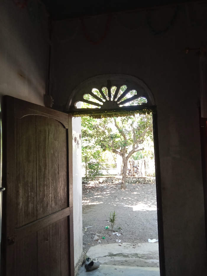 The image depicts an interior view looking outward through an open doorway into an outdoor environment. The interior features dark, unadorned walls, with an electrical conduit visible on the upper left. Faint red and blue draped garlands hang near the ceiling. The doorway consists of a partially open, dark brown wooden door with an arched top and vertical paneling, hinged on the left. Above the main door opening, a light-colored arched transom window displays a decorative fan-shaped, radial spoke pattern. Gold-colored fringe hangs horizontally across the top of the door opening, beneath the transom. The exterior scene is brightly illuminated, casting distinct shadows. The ground immediately outside the doorway is a mix of dirt and irregular concrete or paving, strewn with scattered litter including plastic bags and paper. A single light-colored shoe lies on the ground just outside the threshold, on the left. A small, slender sapling grows in the dirt in the foreground. In the midground, a mature tree with visible branches and foliage stands, partially shading the ground. A low, rough stone wall is situated behind the tree. Further in the background, dense green foliage and the faint silhouette of a motorcycle or bicycle are visible. No individuals, actions, or interactions are present in the scene. Location: Unknown, Unknown.