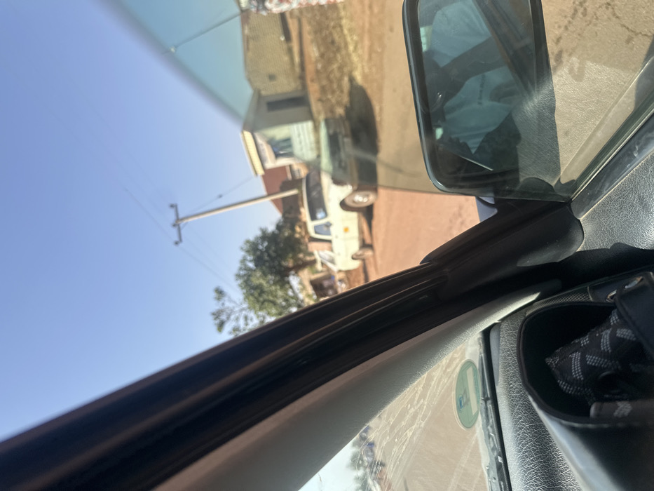 The image depicts a daytime scene in Durimi, Nigeria, observed from the interior of a vehicle looking outward through the front passenger window. The vehicle's black dashboard, A-pillar, and side mirror are visible in the foreground. A black bag containing a grey and white patterned object rests on the dashboard. The side mirror reflects a person in a light-colored shirt. Outside, a reddish-brown unpaved road occupies the immediate exterior foreground. A light-colored pickup truck, possibly white or tan, with a yellow marking on its side, is stopped or parked on the right side of the road, facing left. Behind the truck, a small, light-blue building with a yellow roof fascia is visible, along with other brick or earth-toned structures further back. A tree with green foliage stands to the left of the truck. A utility pole with overhead lines extends vertically near the center of the frame against a clear, light-blue sky. Dust or dirt is present on the vehicle's windshield, which also shows a green sticker in the lower left. No active interactions between people or vehicles are discernible, and the scene is static.