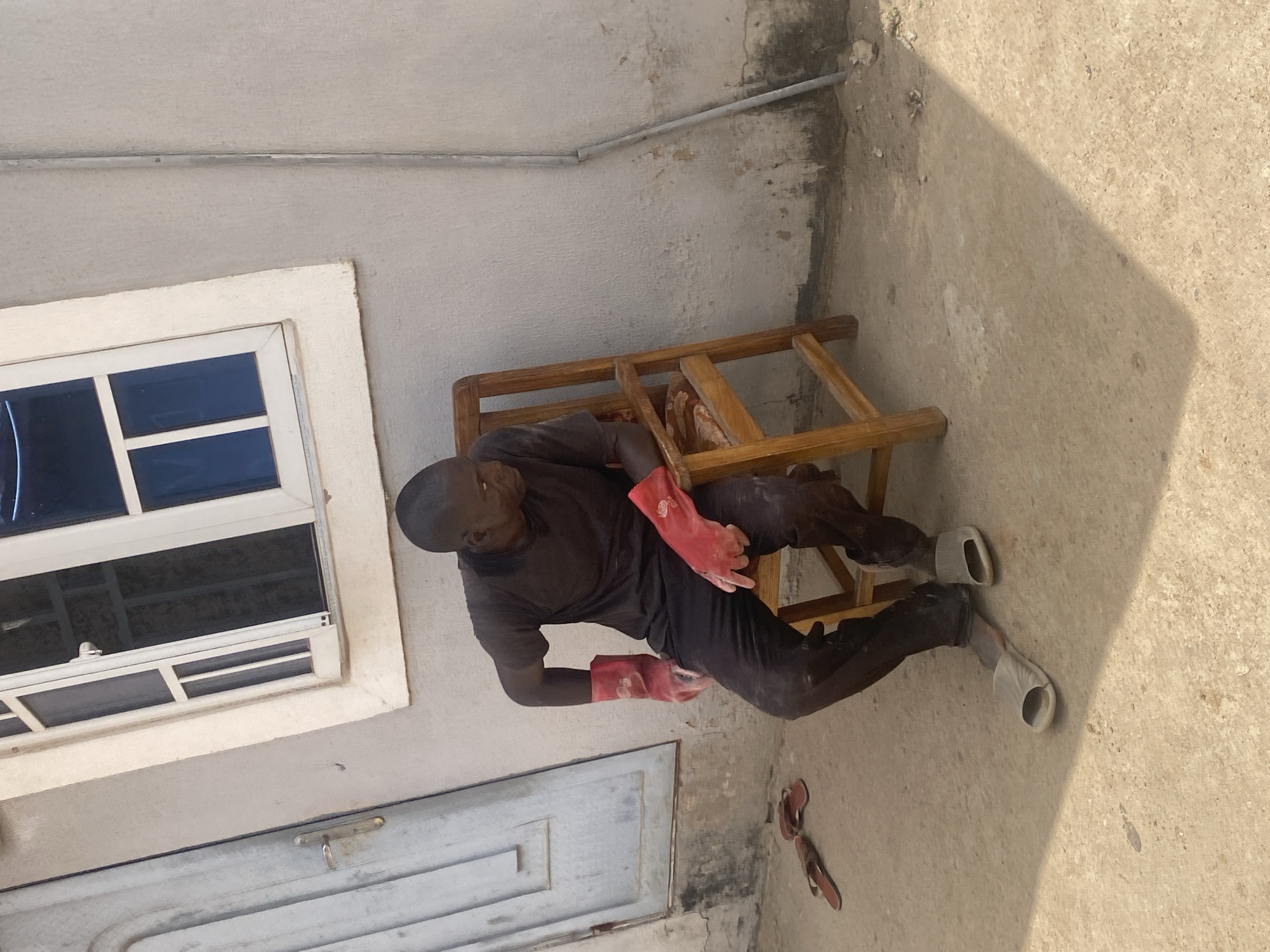 A man wearing red gloves and dark clothing is perched on a wooden step stool outdoors in Rido, Nigeria