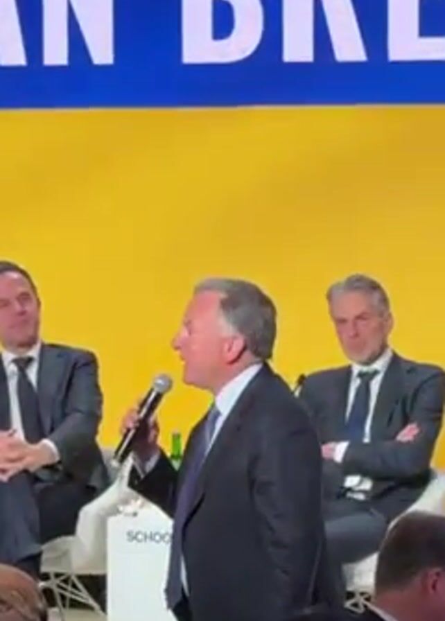 A man in a dark suit is speaking into a microphone at a conference. Behind him on the stage sit several other men in suits. The backdrop behind them is a yellow screen with the words "Ukrainian Break". There are people in the audience, including someone wearing a military uniform. The speaker turns to his right and laughs, while the man next to him smiles.