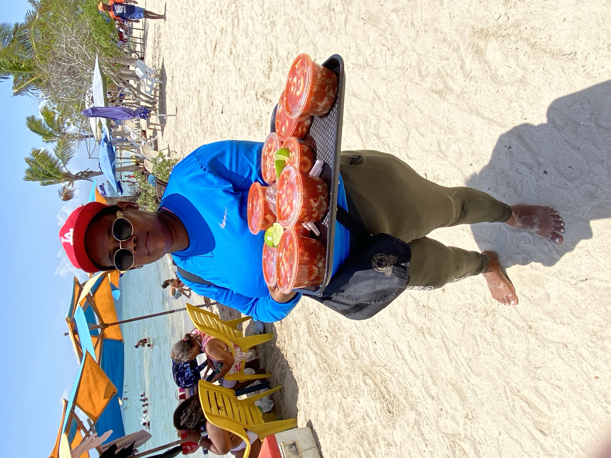 vendor at Los Totumos, Venezuela, standing on a beach. The vendor, wearing a red cap, sunglasses, and a blue long-sleeved shirt, is holding a tray with multiple plastic containers filled with a red-sauce-based food. The vendor also has a black bag slung across the body. The background shows a sandy beach with beach umbrellas, palm trees, and people in the water. Some yellow chairs are present in the foreground.