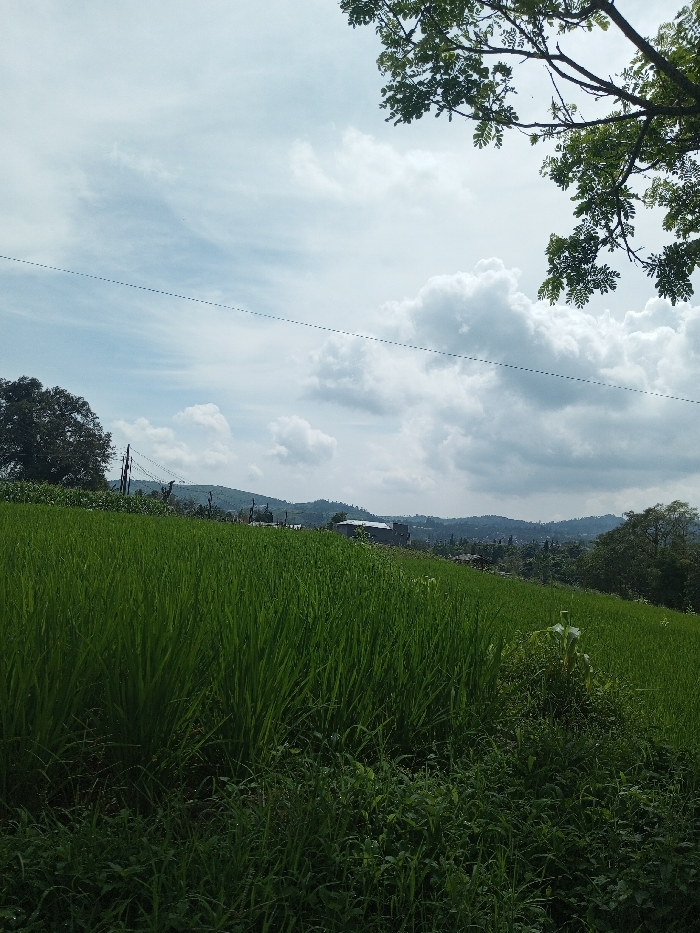 The image displays a rural landscape within Namthoung, Laos. The foreground and midground are dominated by an expansive, sloping field of vibrant green crops, consistent with young rice paddies. Denser, darker green undergrowth occupies the bottom right corner. In the midground, several utility poles with visible wires are positioned on the left, behind the main crop field. Further back and to the right, a light-colored building with a dark roof is discernible among distant structures. A long, dark horizontal line, interpreted as a power line, traverses the upper third of the sky. The background features a line of undulating hills covered in dense green vegetation, meeting a sky with significant white cumulus cloud formations against areas of light blue. The top right corner of the frame is partially obscured by the dark branches and green leaves of an overhead tree. No people are visible within the scene.