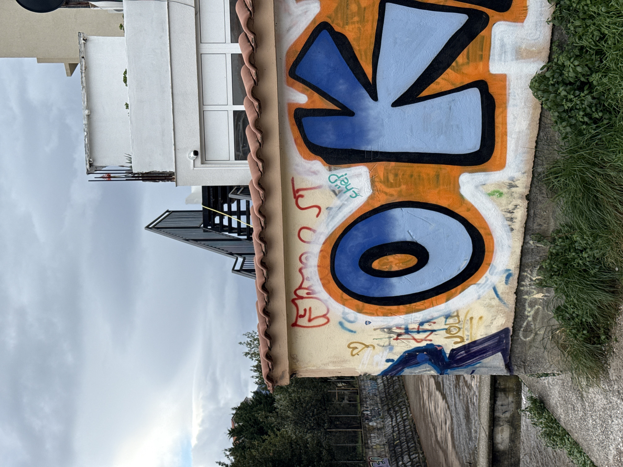 The scene depicts an urban environment in Budva, Montenegro, under an overcast sky. In the foreground, a rectangular, cream-colored wall, topped with terracotta roof tiles, dominates the lower half of the frame. This wall is heavily covered in graffiti, most notably a large, stylized "OK" in blue with orange outlines and black borders. Various smaller tags and designs in red, yellow, light blue, and purple, including a red abstract shape, the word "chep," a yellow heart, and the word "JOJ," are layered around and over the main "OK" graffiti. To the left of the graffiti wall, a concrete drainage channel or small riverbed, partially filled with shallow water, extends into the distance. A concrete retaining wall, also adorned with graffiti, lines the channel. Beyond this, a wire fence runs parallel to the channel, backed by dense green trees and foliage. In the midground and background, behind and above the graffiti wall, stands a multi-story, modern building with white facades. A black metal staircase ascends along the building's exterior. A security camera is affixed above a large white-framed window on a lower section of the building. Various small green plants are visible on ledges or terraces of the building. No individuals are present in the image.