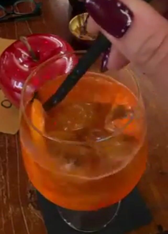 Here's a plain text description of the video: The scene is a close-up shot on a wooden table, likely in a bar or restaurant setting. A hand with dark red polished nails (some with white dots) is stirring an orange-colored drink in a clear, stemmed glass filled with ice. The drink is likely an Aperol Spritz. The straw being used is black. Beside the glass, on the table, is a shiny red decorative apple. In the background, there are small bowls containing olives or other appetizers. A pair of glasses is also visible in the background. The focus is mainly on the drink being stirred.