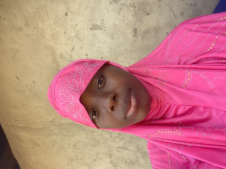 A close-up portrait features an individual with dark skin, facing forward, and looking directly into the camera. The person is wearing a vibrant pink garment comprising a head covering (hijab) and a draped body covering, both adorned with numerous small, light-colored embellishments, possibly rhinestones or beads, arranged in decorative patterns. The background consists of a light brown, textured wall, likely concrete or mud, exhibiting irregular surface characteristics. Faint, etched or written alphanumeric characters, including "5461795", are visible on the upper left section of the wall behind the individual. The scene is located in the city of Egbu, Nigeria.
