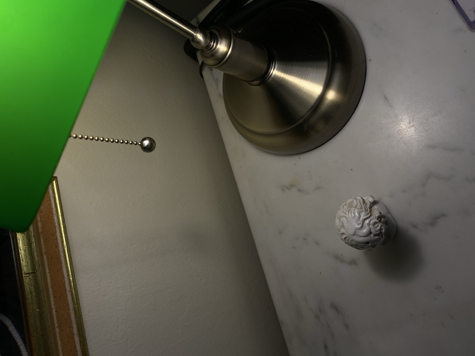The scene is set indoors in the city of Unknown, Unknown, featuring a tabletop or counter with a white marble pattern. A banker's lamp with a green trapezoidal shade and a brushed brass or bronze metallic base occupies the right side of the frame, casting light onto the marble surface. A metal pull chain with a spherical end hangs from the lamp's shade. To the lower left on the marble surface rests a small, off-white, intricately carved bust or head sculpture, exhibiting classical features such as curly hair. A section of an ornate, golden-colored picture frame is visible at the upper edge of the image, positioned against a light-colored wall. No individuals are present.