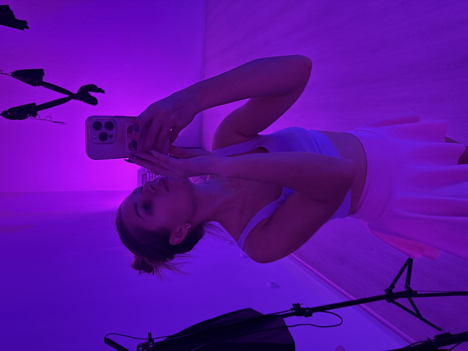 The image depicts a female individual taking a mirror selfie with a light-colored smartphone in an indoor setting in Batumi, Georgia. The subject, an adult with fair skin and hair pulled back in a bun, is dressed in a white crop top and a white pleated mini-skirt. She wears a small hoop earring in her left ear, and her fingernails are dark. The room is bathed in a uniform purple ambient light, tinting the white walls and light-colored wooden floor. A black softbox on a tripod is positioned in the left foreground. On the upper right wall, several dark, silhouetted objects, resembling decorative implements, are visibly suspended. The subject holds the smartphone with both hands, capturing her reflection.