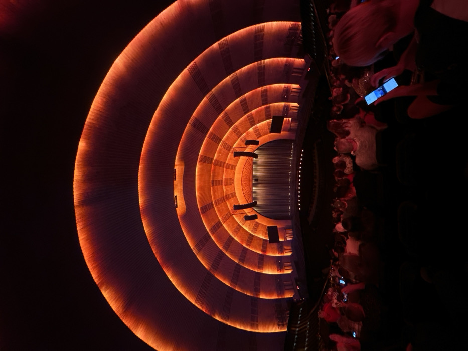 The photo depicts the interior of a large concert hall or theater from an elevated perspective. Orange, concentric rings adorn the ceiling, illuminated to create a warm glow. The stage area is visible in the distance. Along the right edge of the image, audience members are seen in the dim lighting, some holding up phones, presumably to take pictures. The overall impression is one of a grand, elegant performance space.