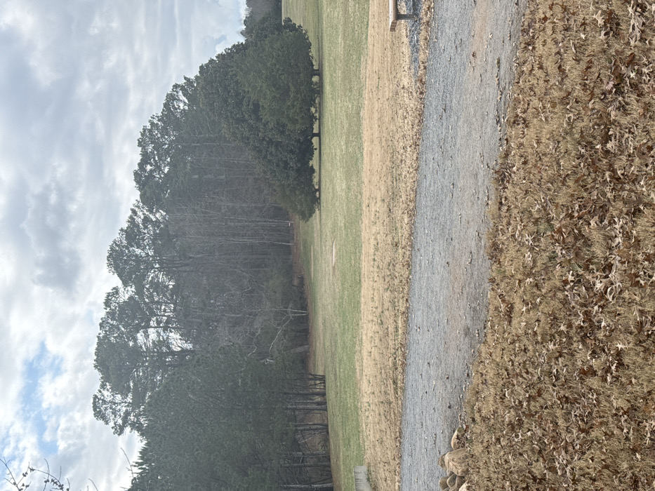 A landscape image featuring a grassy field transitioning into a dense forest under a cloudy sky. A gravel path runs alongside the field, bordered by dead leaves and vegetation on one side. The trees vary in size and density, creating a visual layering effect. The overall scene has a slightly muted color palette, characteristic of a late fall or winter day.