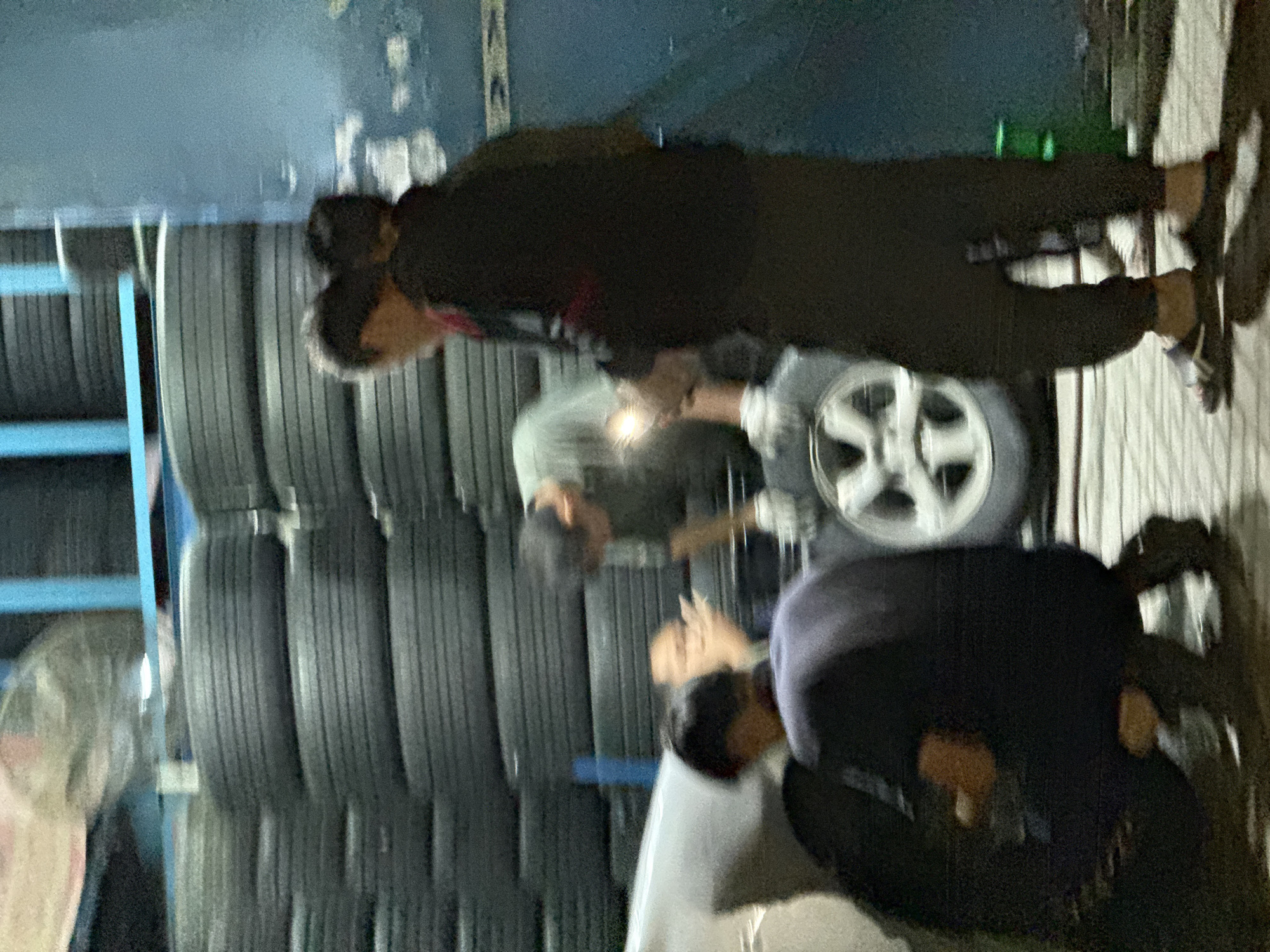 tire shop in Sharjah, United Arab Emirates. Stacks of tires are visible on a blue shelving unit. Three people are present: one is standing, appearing to work on a tire mounted on a wheel; another is leaning over, looking at something on the ground; the third is partially visible, positioned near the ground, looking down. The scene is dimly lit.