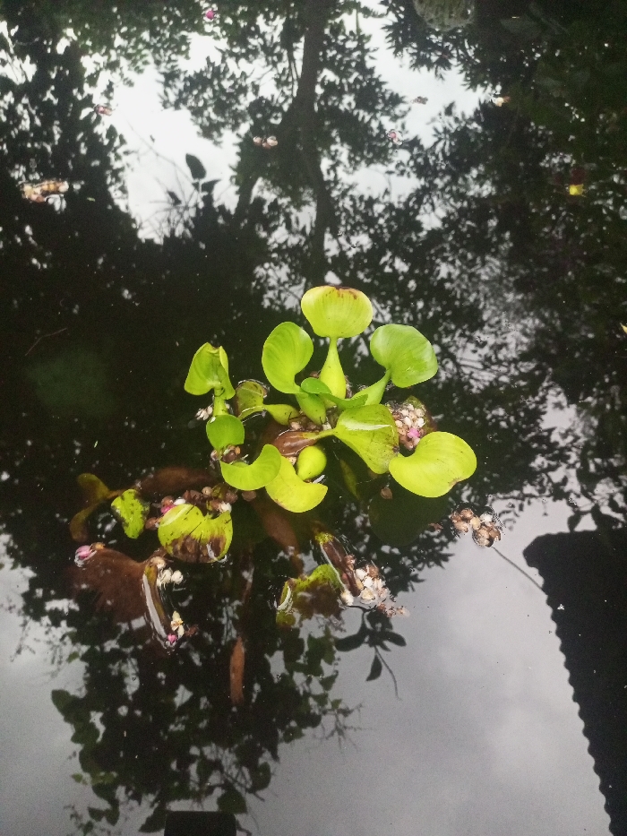 This image depicts a still body of dark water, likely a pond, located in Bamhori, India. Floating prominently in the central and lower portions of the frame are several bright green water hyacinth plants (Eichhornia crassipes) with rounded, bulbous leaves. Clusters of small, light pink or whitish flower buds/seeds are interspersed among the plants and floating on the water's surface. The water acts as a reflective surface, prominently displaying the silhouettes of overhead trees with dense foliage against a bright, overcast sky in the upper half of the image. A faint reflection of what appears to be a dark, corrugated roofline is visible in the lower right corner, suggesting a nearby structure. No human subjects or discernible human actions are present.