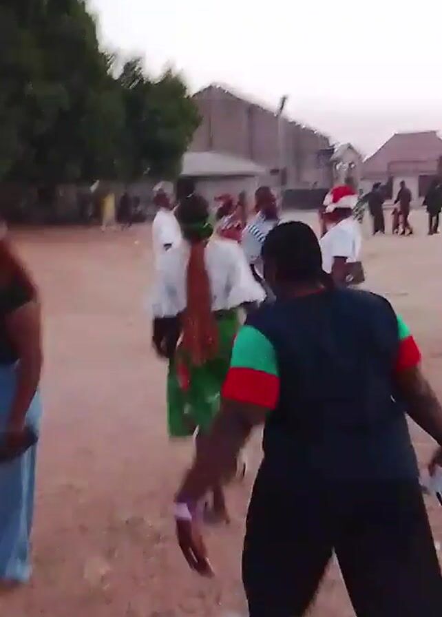 The video depicts a group of people in an outdoor setting. Most of them are standing and seem to be interacting with each other. The ground appears to be a dirt or sandy surface. A woman in a green skirt with red and white patterns, a white top, and a braided ponytail tied with a green bandana is a prominent figure, as the camera follows her. There are other individuals in the background, including some wearing white shirts and a person with a Santa hat. The environment includes trees and buildings, suggesting a village or community setting. The camera is moving, following the woman as she walks. The overall tone seems casual, as people are standing and talking.