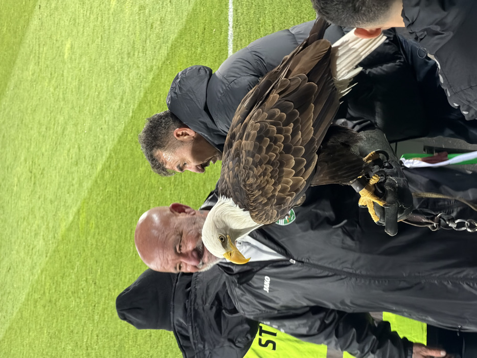 A Bald Eagle (Haliaeetus leucocephalus) with a distinct white head, yellow beak, and dark brown body plumage is prominently featured in the foreground, perched on a black leather falconry glove. Its yellow talons grip the glove, and a metal chain is attached to its left leg. The glove is worn on the left arm of an adult male, bald with a grey beard and mustache, who is smiling and looking towards the right side of the frame. He wears a black jacket displaying a "JAKO" logo and the green and white crest of PFC Ludogorets Razgrad. To his right, a second adult male with dark hair and a mustache, dressed in a dark puffer jacket, observes the eagle or an interaction beyond it with a slightly open mouth. Behind the handler, a third individual wearing a black beanie and a dark jacket over a neon yellow garment marked with "ST" is partially visible. The background consists of brightly illuminated green artificial turf, indicative of a sports stadium. A fourth individual's head and right ear are partially visible on the far right. The scene is located at Huvepharma Arena in Razgrad, Bulgaria.