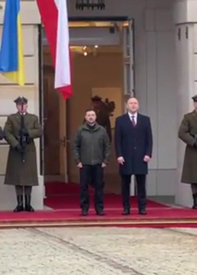 Two men stand on a red carpet in front of a building with a red and white Polish flag and a blue and yellow Ukrainian flag. Four military guards stand at attention, two on either side of the men. The man on the left wears a green jacket and black pants. The man on the right wears a black coat with a red tie. A third man in uniform stands in the background, inside the building. A trumpet plays in the background.