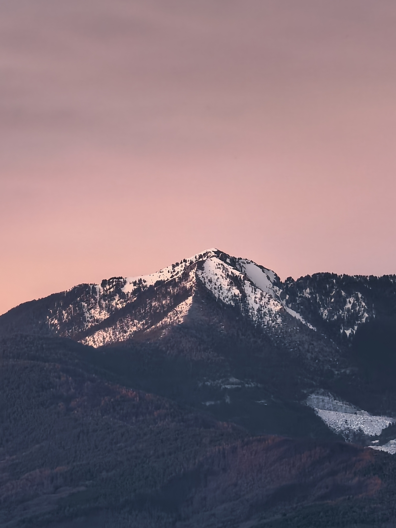 mountain range in Mikrevo, Bulgaria, partially covered with snow on its higher elevations. The sky is a pale pink, suggesting either sunrise or sunset. Dense forests cover the lower slopes of the mountains, transitioning to snow-covered patches higher up. A notable feature is a section where deforestation or a landslide has occurred, revealing lighter-colored terrain amidst the dark forest.