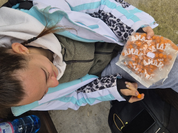 A high-angle view captures a female subject in Chargan, Bulgaria, seated outdoors. The subject, visible from the upper torso downwards, has dark hair styled with a thin braid and wears a small gold stud earring in her visible right ear. She is dressed in layered clothing, including an olive-green zippered fleece, a light grey hoodie, and an outer white and light blue jacket featuring black and white leopard print patterns on the sleeves. Grey trousers are also visible. Her gaze is directed downwards towards her hands. Her left hand, displaying pink painted fingernails on the pinky finger, is picking up a small, spherical, orange object. Her right hand holds a transparent plastic bag, which contains a large quantity of identical orange objects. The bag is marked with repeated text, "SLIZE," and features a white sticker with indistinct markings. To the subject's left, a black bag or backpack is present, upon which a black smartphone with its screen facing up rests. A yellow cord or strap is partially visible near the phone. In the upper left background, a clear plastic bottle with a blue cap, containing a blue liquid (labeled "DEVIN"), is situated near a wooden structure. The ground beneath the subject appears to be a light grey paved or concrete surface.