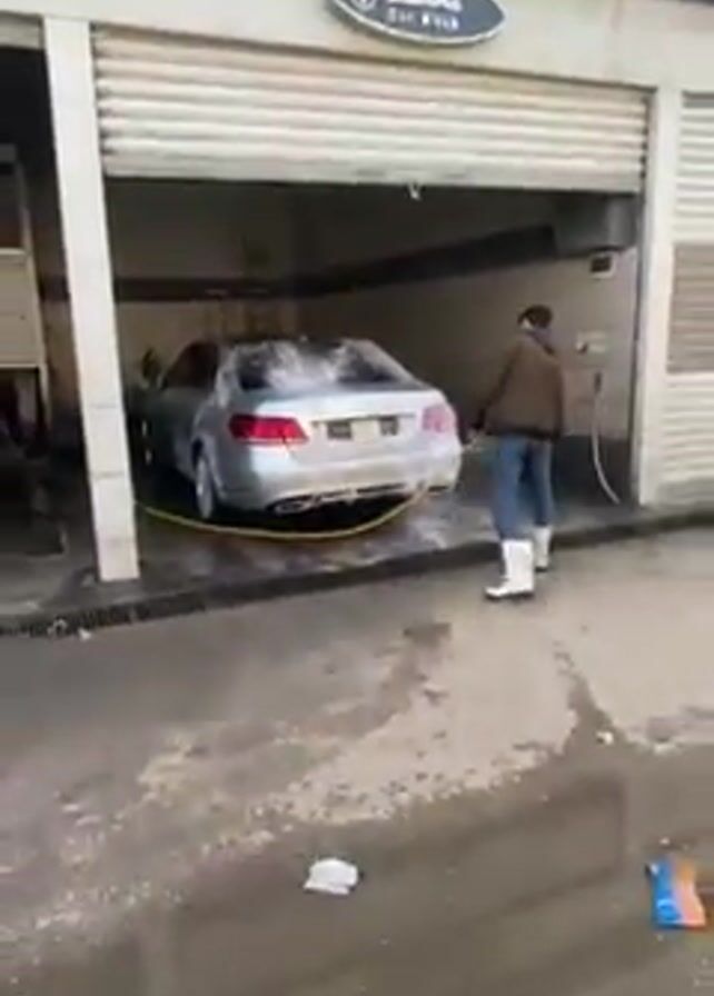silver Mercedes-Benz sedan being washed in an indoor car wash bay. The car is covered in soapy foam. A person wearing jeans and white rubber boots is using a yellow high-pressure hose to rinse the car, starting from the rear. A gray wall is visible in the background, and a ladder leans against the wall on the left. The car wash bay has a grated floor.