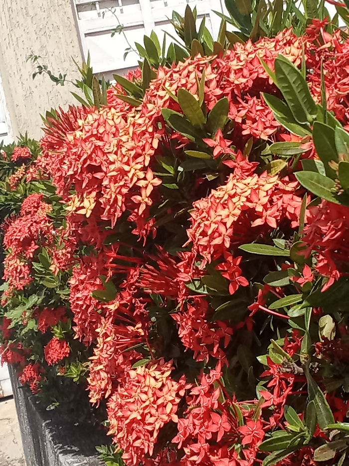 - "The image depicts a vibrant, dense hedge of red and orange Ixora flowers in an outdoor setting in Juan Griego, Venezuela" by FM-ekBOG3, licensed under CC BY 4.0